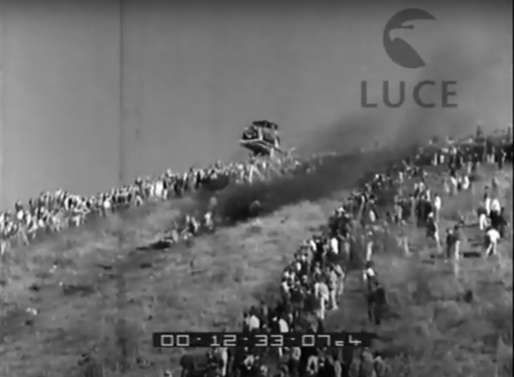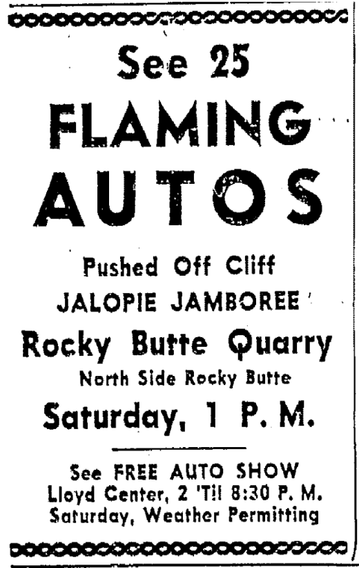 At this still image from the film footage you can see Hill Military Academy in the background and also the “Tallest Flag Pole West of the Mississippi”. This first flaming “dumping” event was on the western slope of the Butte. However in the 1950s there was another flaming event where the auto promoters launched them off the northeastern cliff sides and down into the old quarry. Believe it or Not, it really happened at Rocky Butte!