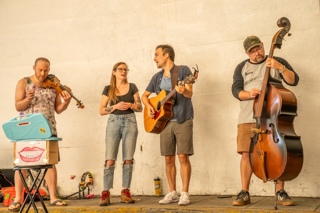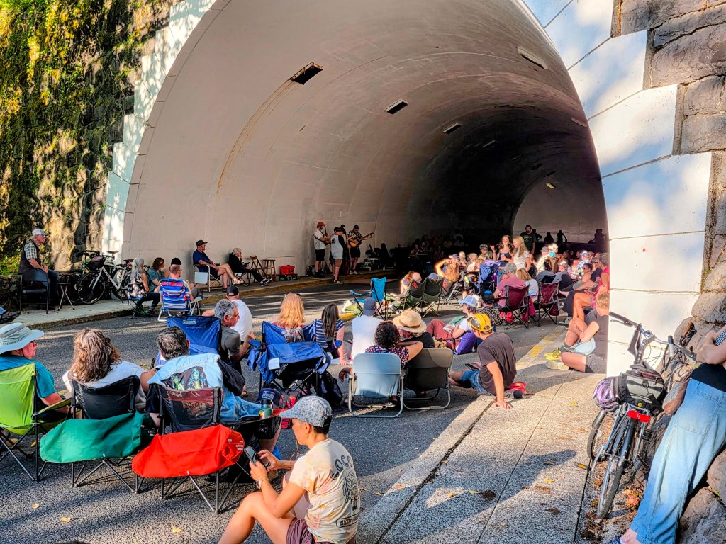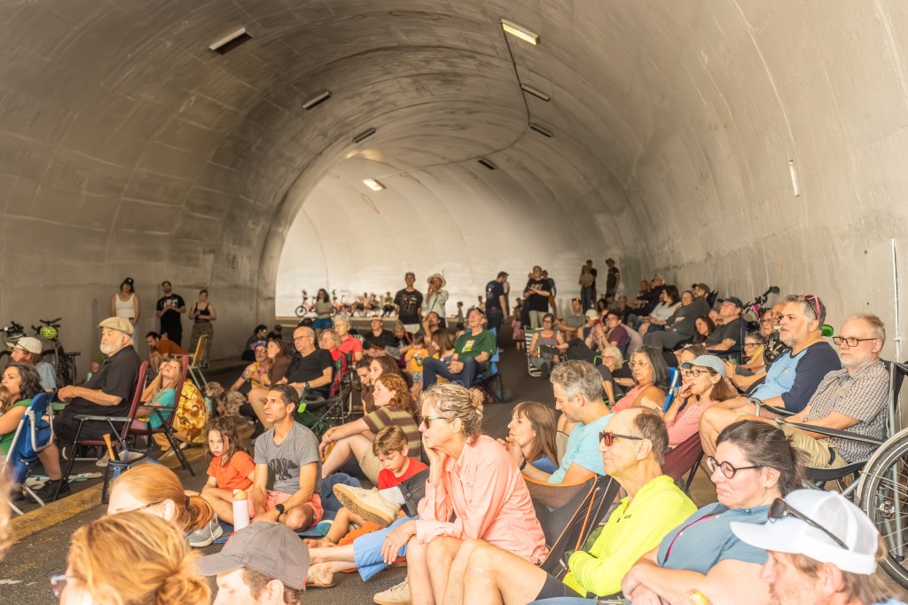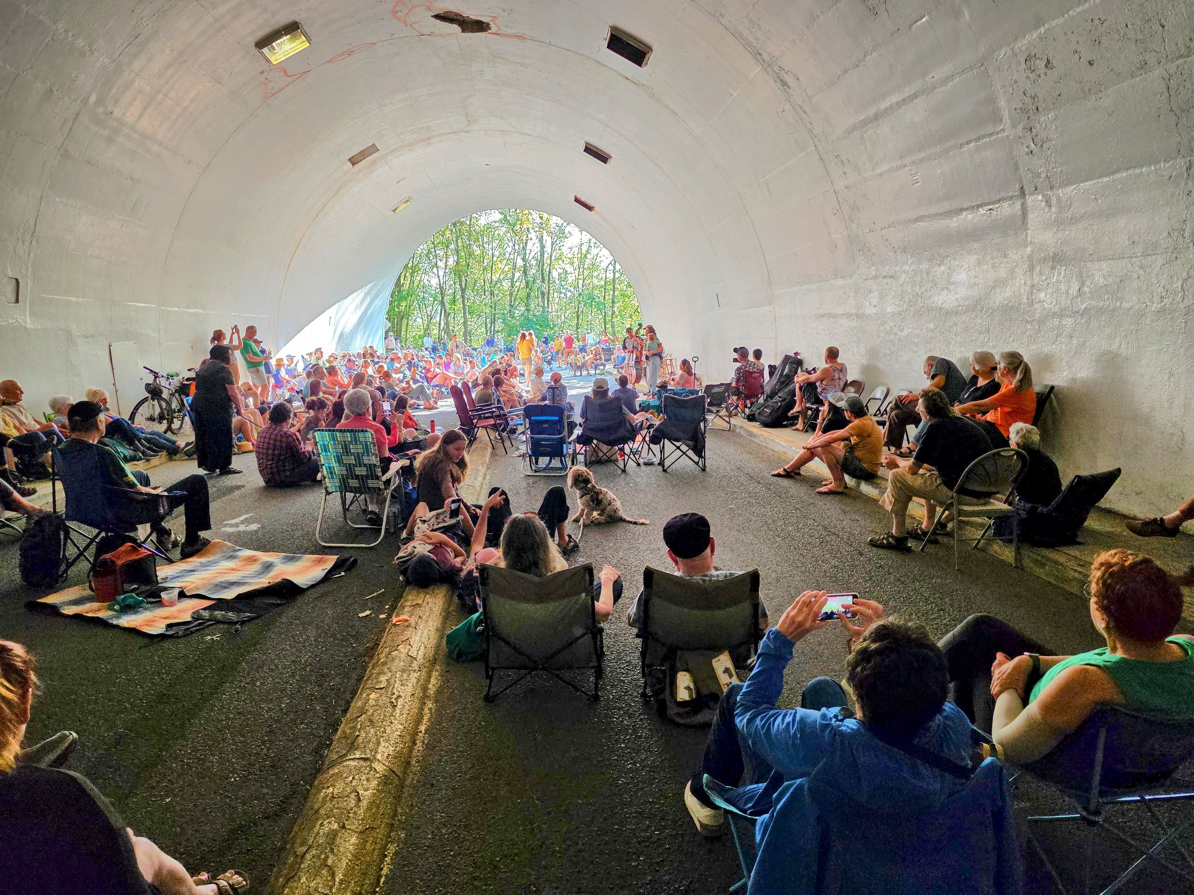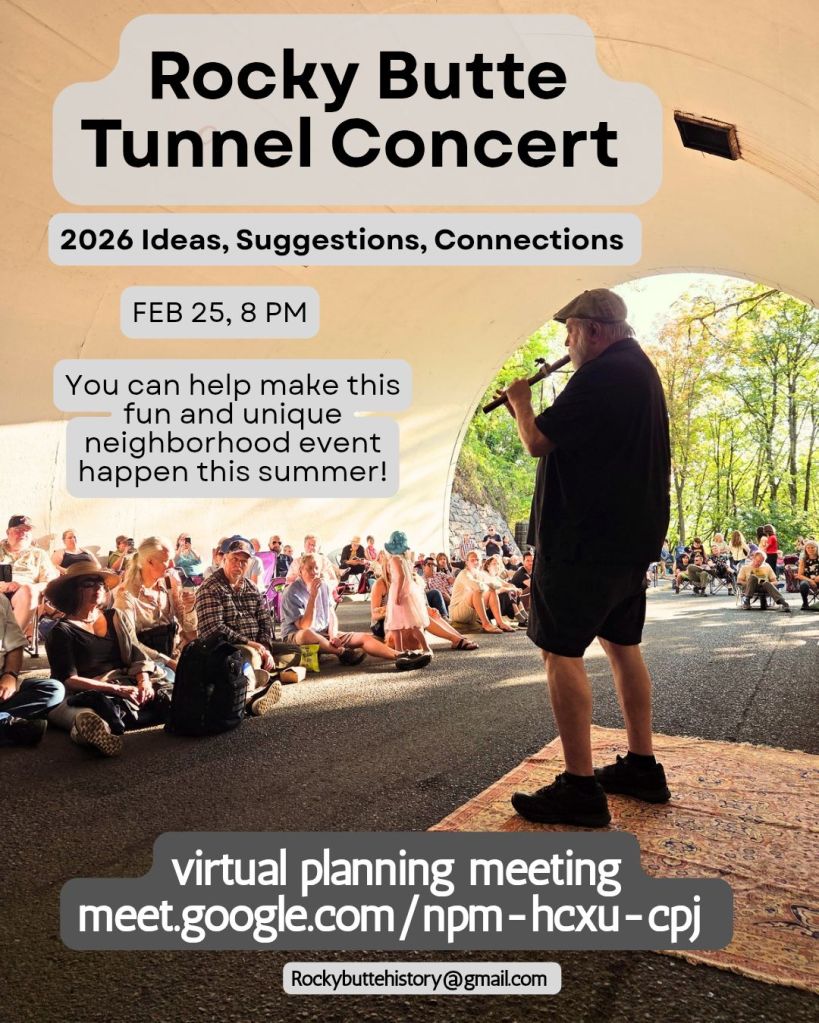 The next Tunnel Concert is lining up to take place on September 12, 2026 from 2-6pm at the Rocky Butte Tunnel! The first annual acoustic concert happened on September 20th 2025. It was a collaboration between the Rocky Butte Preservation Society, The Friends of Rocky Butte, and the Madison South Neighborhood Association. The idea originated among neighbors who love to hear “Alex, the guy who plays his saxophone in the tunnel”. Being a giant macaroni-noodle shaped tunnel carved into an extinct volcano, this architectural structure is simultaneously an amazing acoustic structure that amplifies his melodies across the whole neighborhood. A summer date was set and a variety of other musicians and instruments joined to fill the space with sound. A significant number of community members trekked up the butte to gather in this unique landmark, absent of cars. The general vibe of the event was a simple potluck block party, but instead of picnic tables and grass lawns there were masonry walls and concrete curbs, all which were recently swept and sprayed clean by volunteers the week prior. Families, kids, dogs and cyclists came together to enjoy the party. The local Fresh Love Neighborhood Cafe and Market feed the musicians and many neighbors brought a bounty of treats to make it a down home good time. The mission of the Rocky Butte Preservation Society and the Friends of Rocky Butte is to create safe public access to the natural wonders and historical features of the butte. It was a local celebration to promote local preservation! (Photos by Keri Friedman) Click here to see an article by the Willamette Week published in the month leading up the event in 2025.