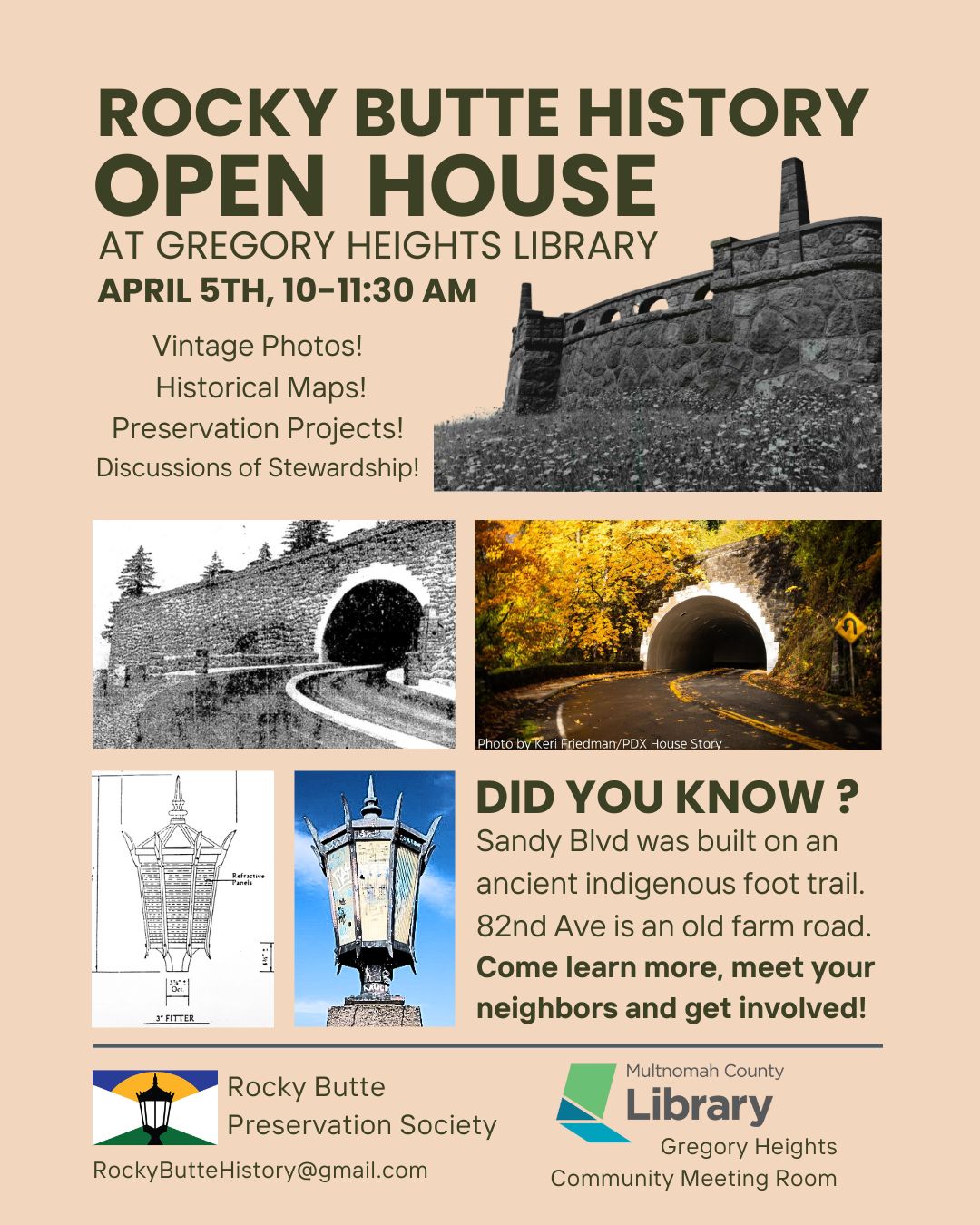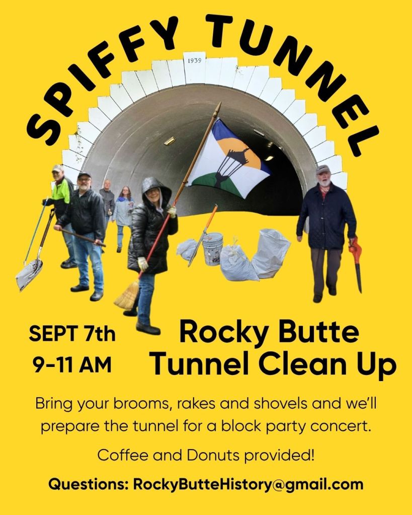 September 20th 4pm, Come meet your neighbors and hear acoustic novelties! Bring your lawn chair and dinner to the Rocky Butte tunnel, this Potluck block party will take place inside a volcano, literally. Walking and rolling up 0.3 mile of scenic route will be best since Rocky Butte Rd will be blocked off to cars at NE Russell and 92nd ave. A minivan shuttle will be available to any that need it. A portable restroom will be on location. Bring a dish to share, see familiar faces and join this local adventure!